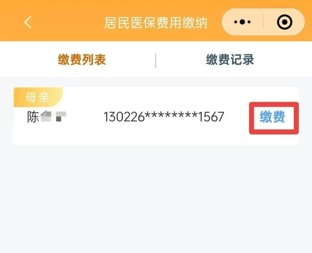2. 在缴费列表模块,点击缴费。注:缴费列表仅展示参加城乡居民基本医疗保险的亲属。