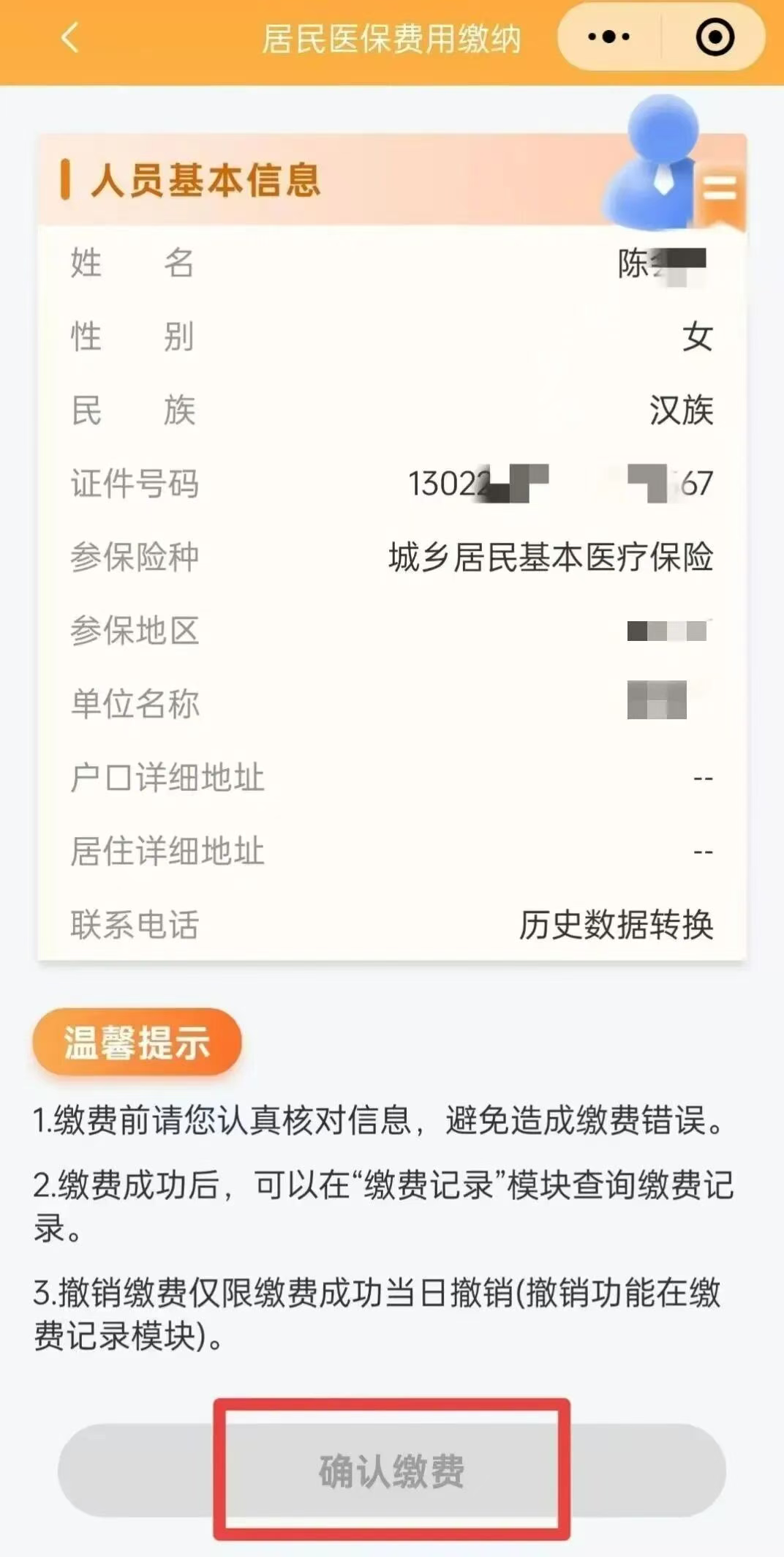 4. 仔细核对人员基本信息、缴费信息,确认准确无误后,点击确认缴费,进入支付页面。