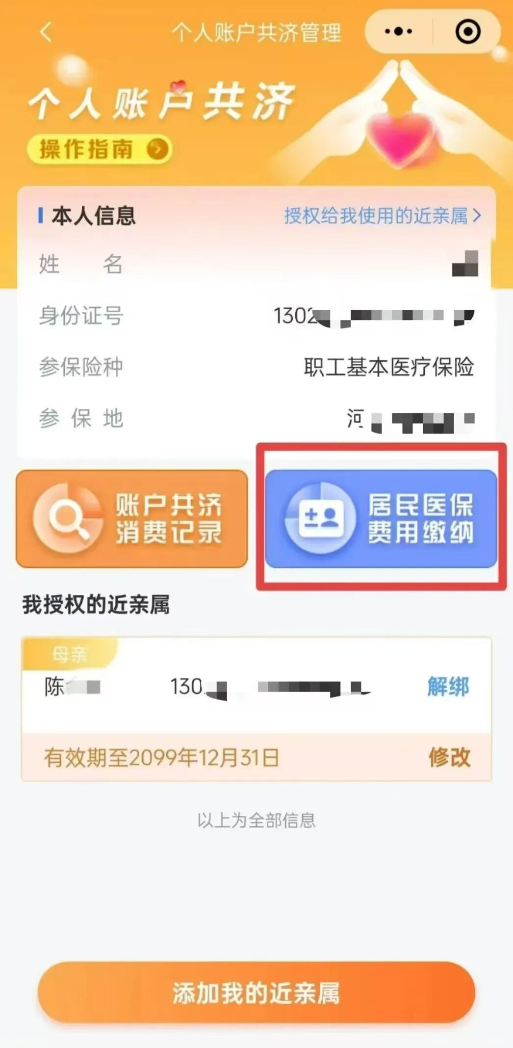 河北省内正常参加职工医保的参保人员,可选择“河北智慧医保”微信、支付宝小程序绑定共济账户,然后代家人缴纳居民医保费。具体步骤为:
