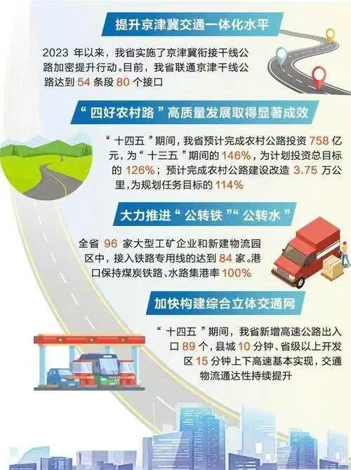 五年来,我省不断织密京津冀衔接干线公路网,“四好农村路”高质量发展取得显著成效,全省通村畅乡的农村路网基本形成,交通物流通达性持续提升,综合交通运输体系建设实现突破性进展。