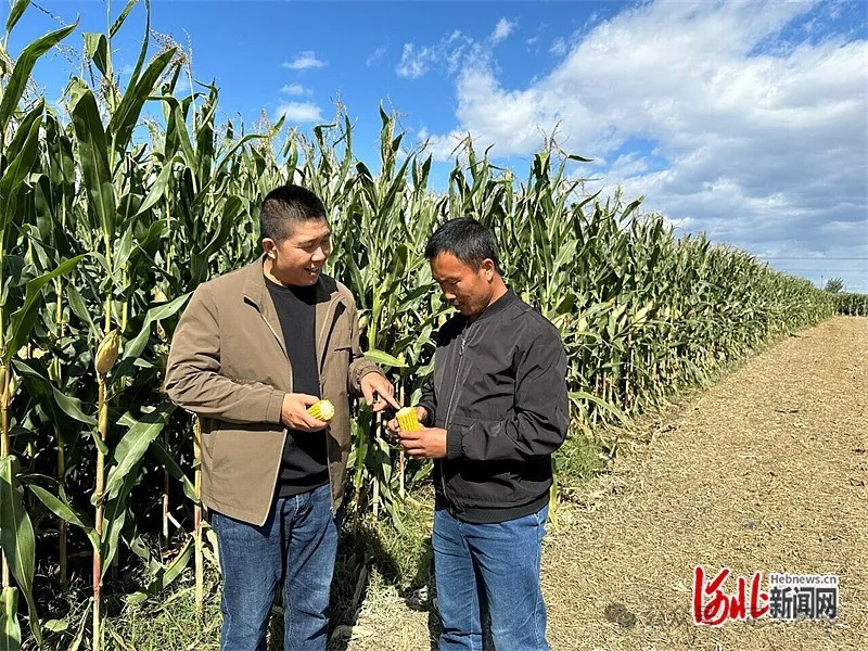 10月1日,在定兴县姚家庄土地专业合作社的玉米地里,合作社“CEO”姚大伟(左)在给“新农人”进行“现场教学”。河北日报记者 徐 华摄