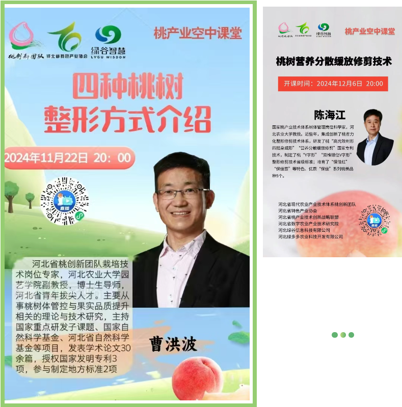 自2023年以来,河北省桃产业创新团队充分依托线上平台,创新推出“周末空中课堂”,组织国家和省桃产业技术体系岗站专家、省内外桃科研专家和种植能手30多人,讲授80多场次,每年吸引省内外30000多桃农线上听课,及时有效指导桃园管理,传播先进生产理念,有力促进了桃产业高质量发展。