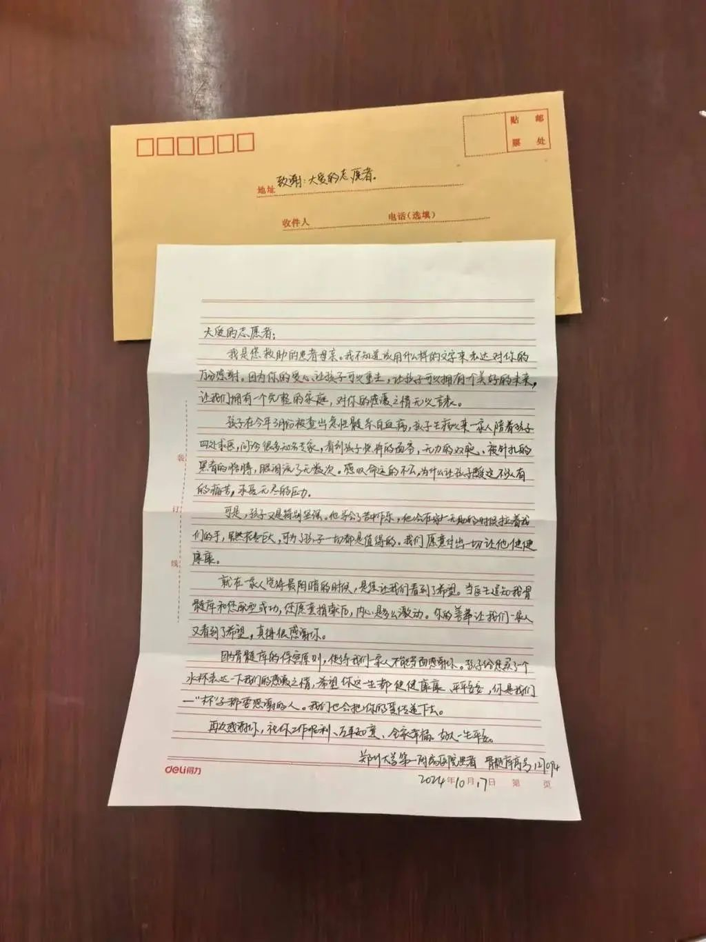患者家属给李建辉的手写信。(黄雨晗/摄)