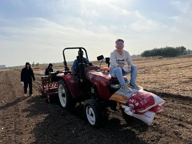 2022年10月,曲周县李口村,四个人在新承包的地里播种冬小麦。