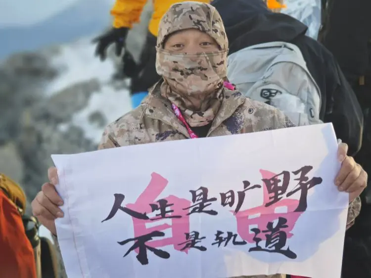 奥太娜雪山是王辉目前攀登过难度最大的山,山路十分复杂,有时候他需要一手拿着拐杖,一手攀住岩壁进行攀爬。最终,历经3个多小时的攀登,王辉成功登顶海拔5200米的奥太娜峰。“站在峰顶,我看到很多年轻人都举着一面旗子,上面写着‘人生是旷野,不是轨道’,感觉很契合我,我虽然身体残疾了,但是人生还有无限可能。”
