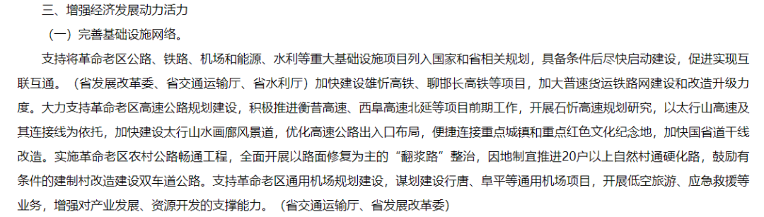 在《实施意见》中,“增强经济发展动力活力”是主要任务之一。在这方面内容中,《实施意见》提出了三项具体举措,排在首位的就是要完善基础设施网络:支持将革命老区公路、铁路、机场和能源、水利等重大基础设施项目列入国家和省相关规划,具备条件后尽快启动建设,促进实现互联互通;加快建设雄忻高铁、聊邯长高铁等项目,加大普速货运铁路网建设和改造升级力度;大力支持革命老区高速公路规划建设,积极推进衡昔高速、西阜高速北延等项目前期工作,开展石忻高速规划研究,以太行山高速及其连接线为依托,加快建设太行山水画廊风景道,优化高速公路出入口布局,便捷连接重点城镇和重点红色文化纪念地,加快国省道干线改造。