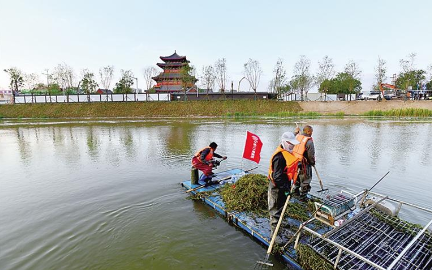 工作人员在运河南川楼段打捞杂草
