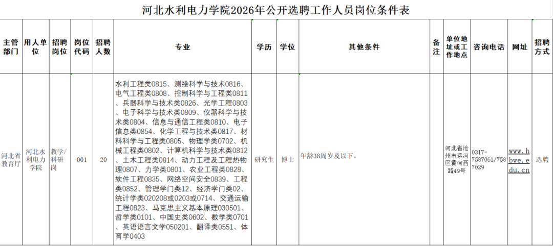 2026年河北水利电力学院拟公开选聘具有博士研究生学历并且获得博士学位的工作人员20名,年龄在38周岁以下(1987年2月25日以后出生)。