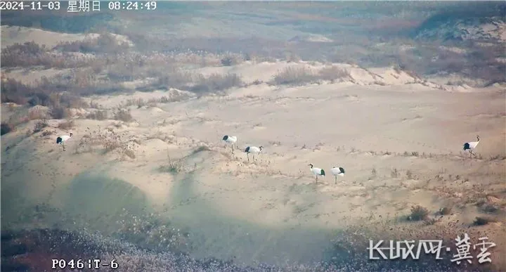 丹顶鹤作为国家一级保护动物,通常栖息于湿地和稻田等生态环境。此次在沙丘地带的现身,不仅为保护区增添了一道罕见的自然景观,也为生物多样性研究和当地生态价值评估提供了新的参考。