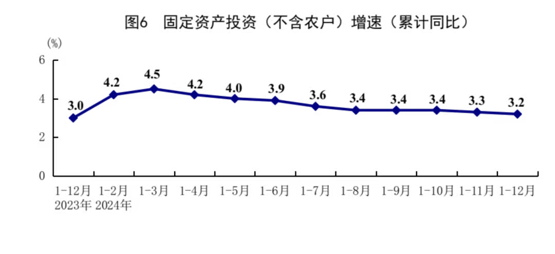 全年全国固定资产投资(不含农户)514374亿元,比上年增长3.2%;扣除房地产开发投资,全国固定资产投资增长7.2%。分领域看,基础设施投资增长4.4%,制造业投资增长9.2%,房地产开发投资下降10.6%。全国新建商品房销售面积97385万平方米,下降12.9%;新建商品房销售额96750亿元,下降17.1%。分产业看,第一产业投资增长2.6%,第二产业投资增长12.0%,第三产业投资下降1.1%。民间投资下降0.1%;扣除房地产开发投资,民间投资增长6.0%。高技术产业投资增长8.0%,其中高技术制造业、高技术服务业投资分别增长7.0%、10.2%。高技术制造业中,航空、航天器及设备制造业,计算机及办公设备制造业投资分别增长39.5%、7.1%;高技术服务业中,专业技术服务业、科技成果转化服务业投资分别增长30.3%、11.4%。12月份,固定资产投资(不含农户)环比增长0.33%。