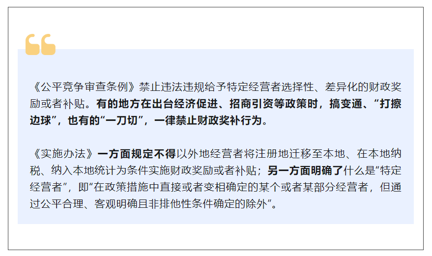 (三)以外地经营者将注册地迁移至本地、在本地纳税、纳入本地统计等为条件,实施财政奖励或者补贴;