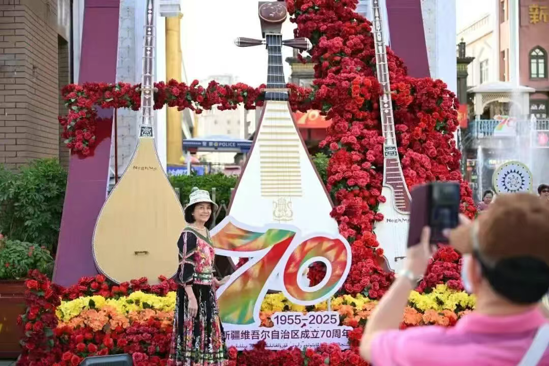 9月23日,游客在新疆乌鲁木齐市大巴扎步行街一处装饰拍照留念。中新社记者 田雨昊 摄