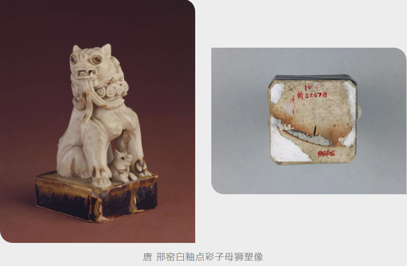 如今,邢窑陶瓷烧制技艺已被列入国家级非物质文化遗产代表性项目名录,得到了有效的保护和传承。 新一代邢窑人在继承传统技艺的基础上,不断创新,将邢白瓷与现代科技、时尚元素相结合,推出了手绘茶具、餐具、文创摆件、国潮首饰等多样化产品,让古老的邢窑焕发了新的生机与活力。 ·邢窑白釉皮囊式壶,唐,通高12.5厘米,口径2.2厘米,底径12.5厘米。壶提包式,上窄下宽,形似袋囊。顶端一侧为短直小流,中间有一曲柄,另一侧饰一曲尾。袋囊的转折处饰有凸起的摺线纹,中间亦饰凸线一道。此壶通体施白釉,在有装饰线的积釉处,釉泛青白色。平砂底,以行草书体刻划工匠名称“徐六师记”四字。 ·邢窑白釉点彩子母狮塑像,唐,高10.8厘米,底边长6.3厘米。母狮昂首,两眼凸起,双耳直立,张口露齿,长须卷发,前腿直,后腿曲,尾上卷,伏卧于台上。母狮两前腿间有一小狮趴卧。狮身皆施白釉,母子双狮眼睛及母狮腿部均点以褐彩。台为正方体形,四周施褐色釉,浓重处呈黑色。