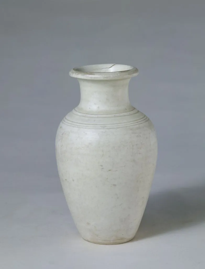·邢窑白釉瓶,高14.4厘米,口径6厘米,足径7.2厘米。瓶口外撇,肩下渐收,底足平实。通体施白釉,釉色无杂质,瓶体除肩部刻划两组弦纹外,别无纹饰。