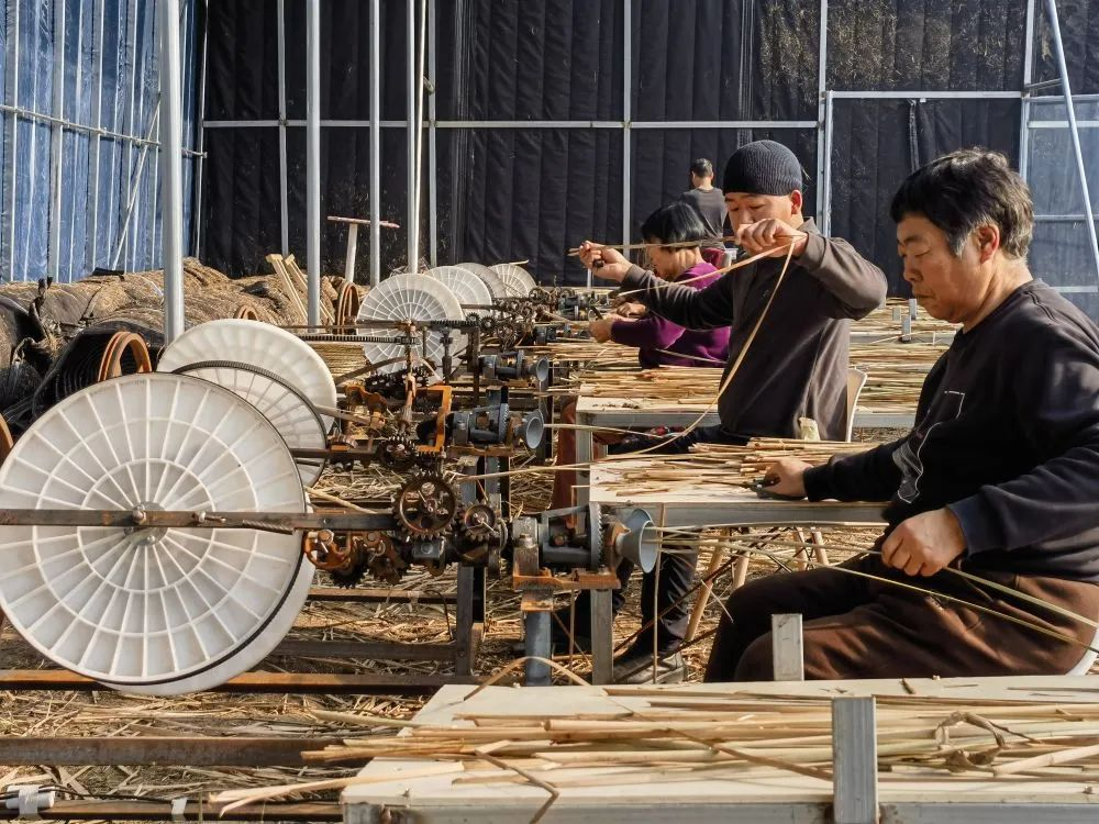 12月25日,安新县大赵庄村村民在大棚内用机器编织蒲草绳。
