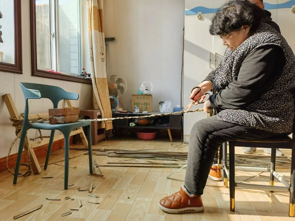 12月25日,安新县大赵庄村村民在家中编织蒲草辫。