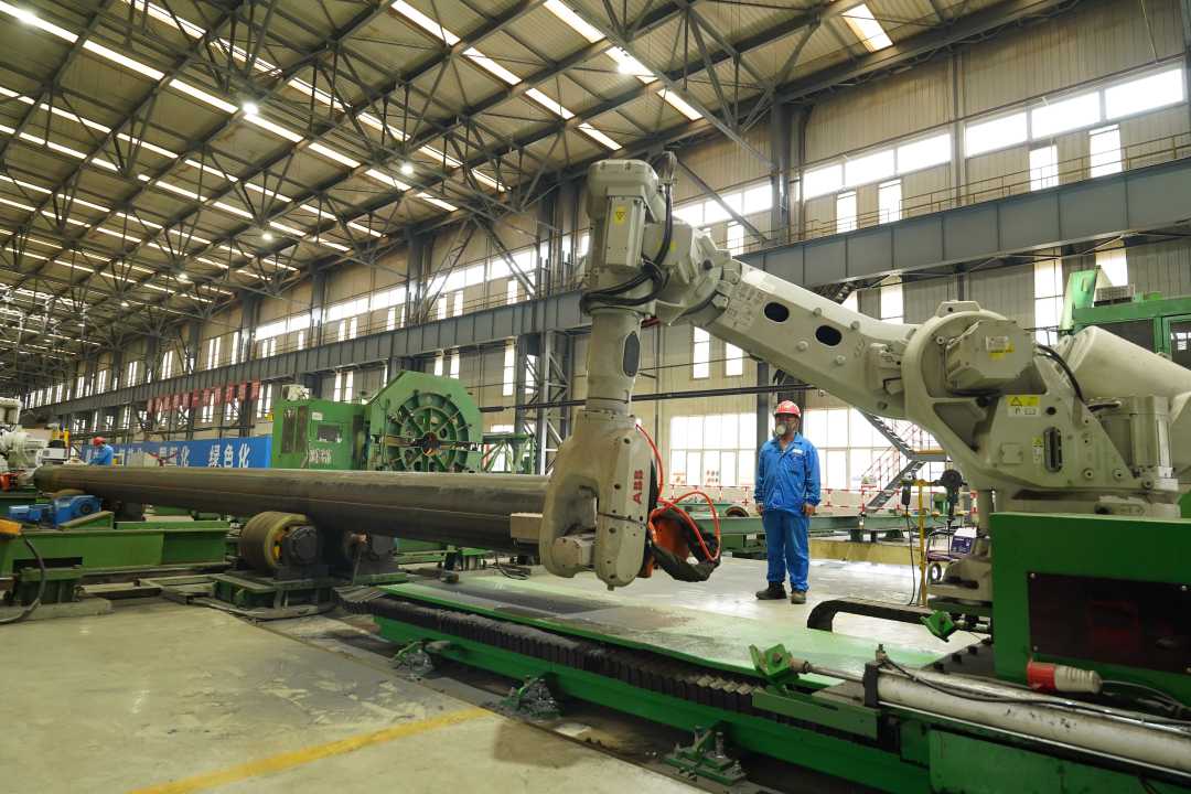 中油宝世顺(秦皇岛)钢管有限公司生产车间内六轴机器人对输氢管进行管端焊缝修磨。王继军摄