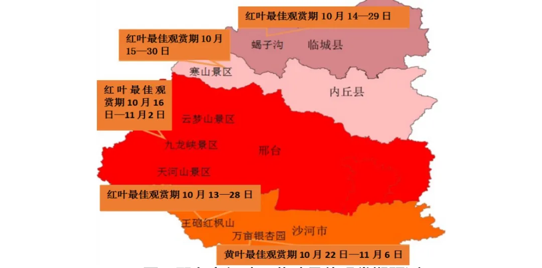 近日,邢台市气象局发布2024年邢台市红叶、黄叶最佳观赏期预测显示,根据邢台市历年的气象条件和红叶、黄叶的生长特性,结合目前的红叶、黄叶主要树种生长情况和未来天气形势预测,预计今年邢台市红叶最佳观赏期为10月13日—11月2日,黄叶最佳观赏期为10月22日—11月6日。