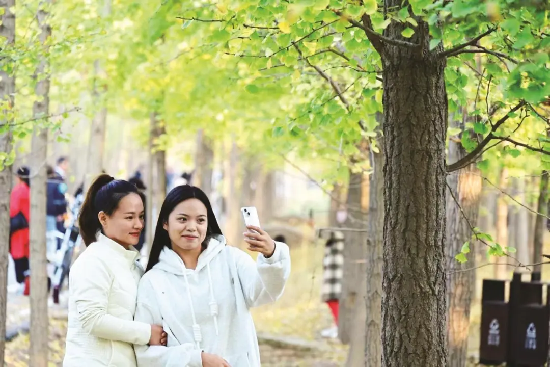 树与风嬉闹,人同叶相视。霜降给凤城带来了阵阵凉意,却无法掩饰金叶飘、玉枝摇的火热银杏林,10万余株银杏树和如织的游人一起勾勒出一幅文旅融合的绚丽画卷。