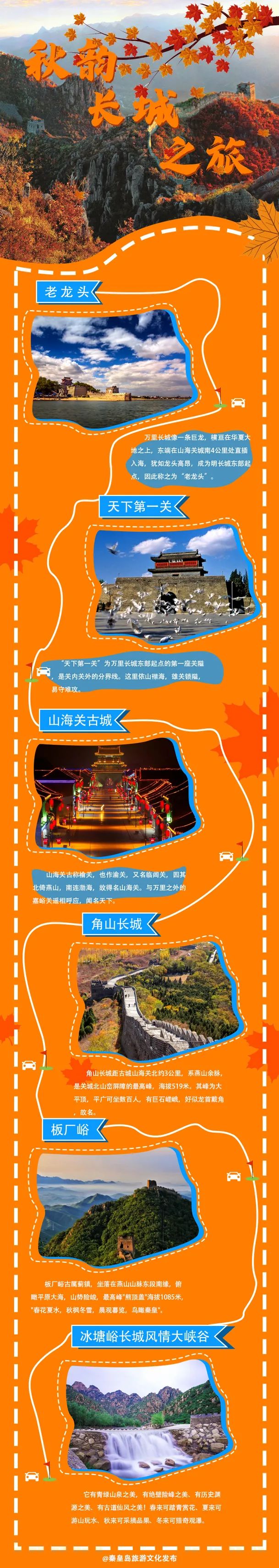 223.1公里古长城横亘在我市境内,连山、海、关、城于一体,是万里长城最精华部分。秋韵长城之旅推荐的参观点有老龙头、天下第一关、山海关古城、角山长城、板厂峪、冰塘峪长城风情大峡谷等。