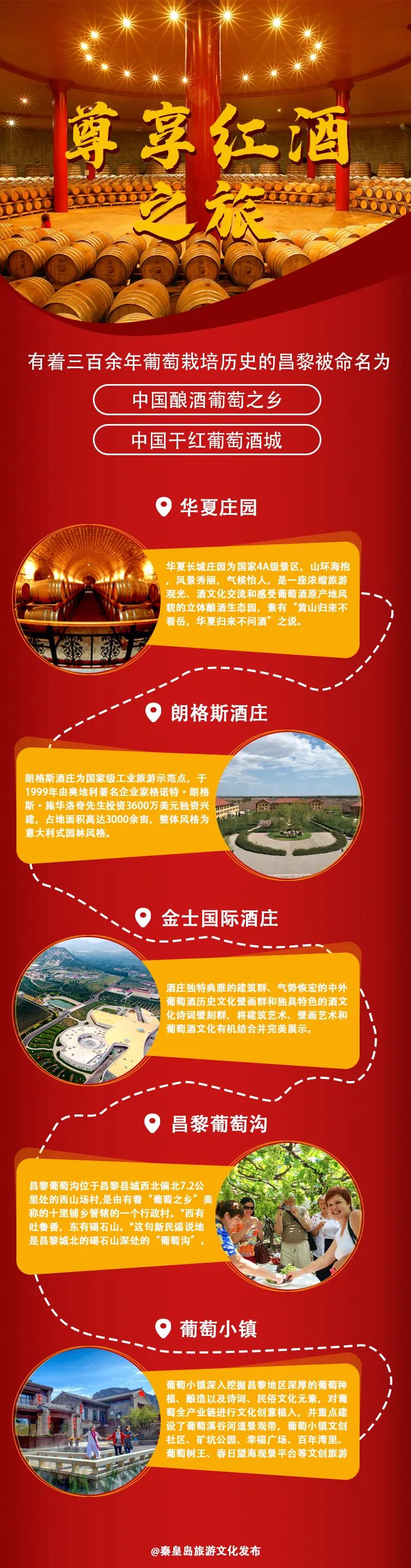 昌黎被命名为“中国酿酒葡萄之乡”、“中国干红葡萄酒城”。尊享红酒之旅推荐的参观点有华夏庄园、朗格斯酒庄、金士国际酒庄、地王干红酒庄、昌黎葡萄沟、昌黎玛蒂尼酒庄、葡萄小镇等。
