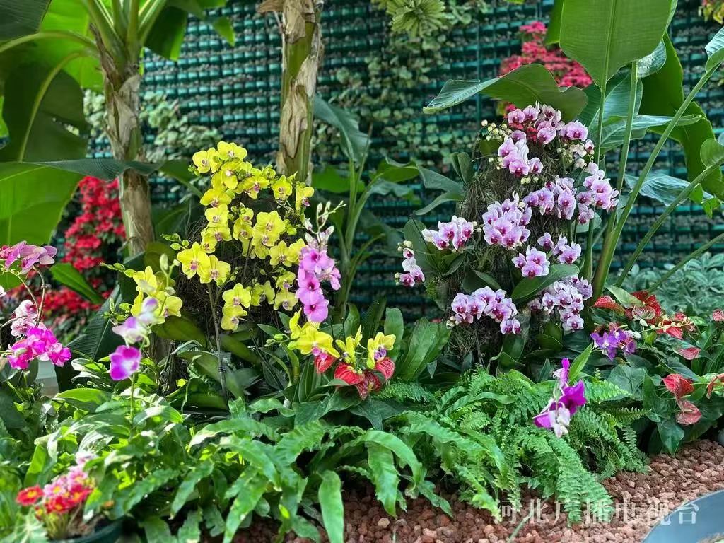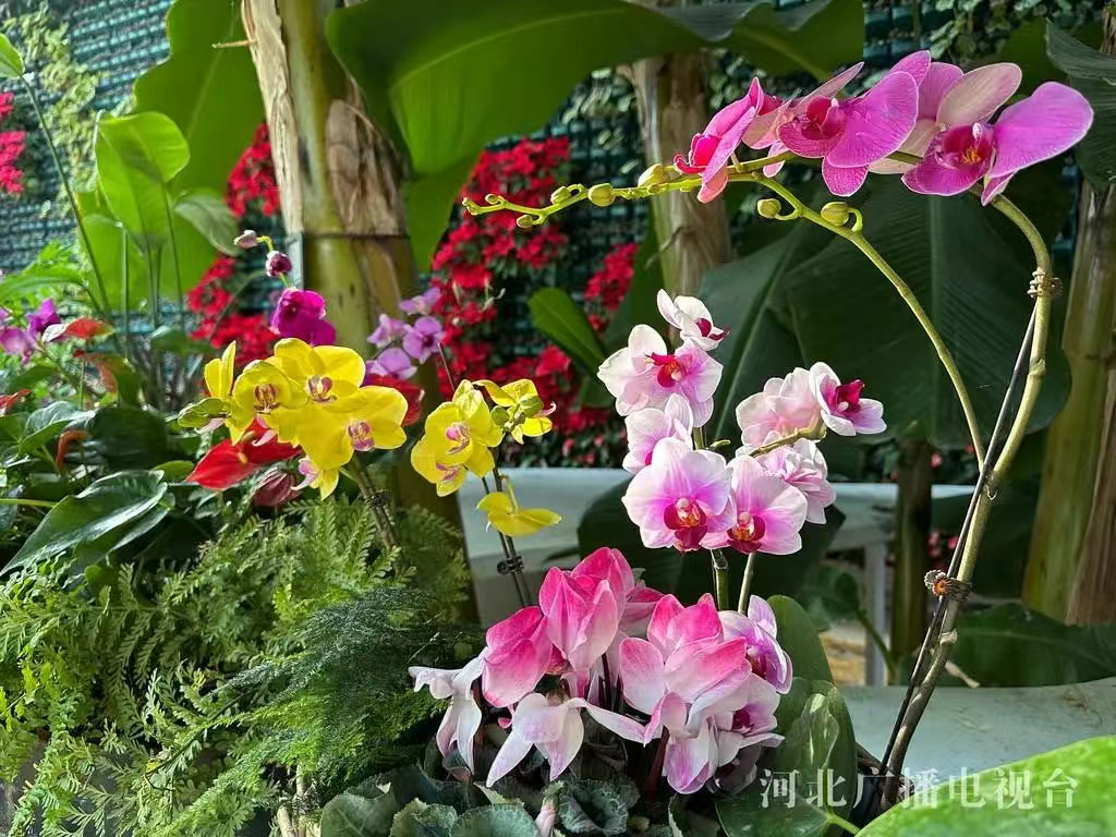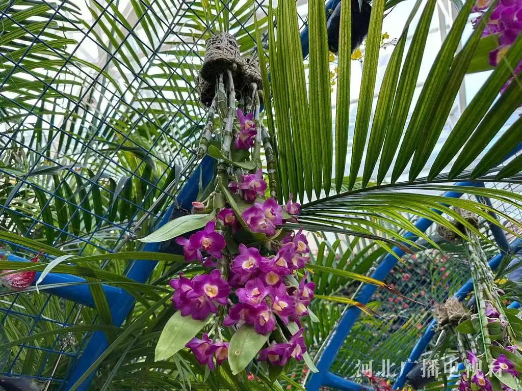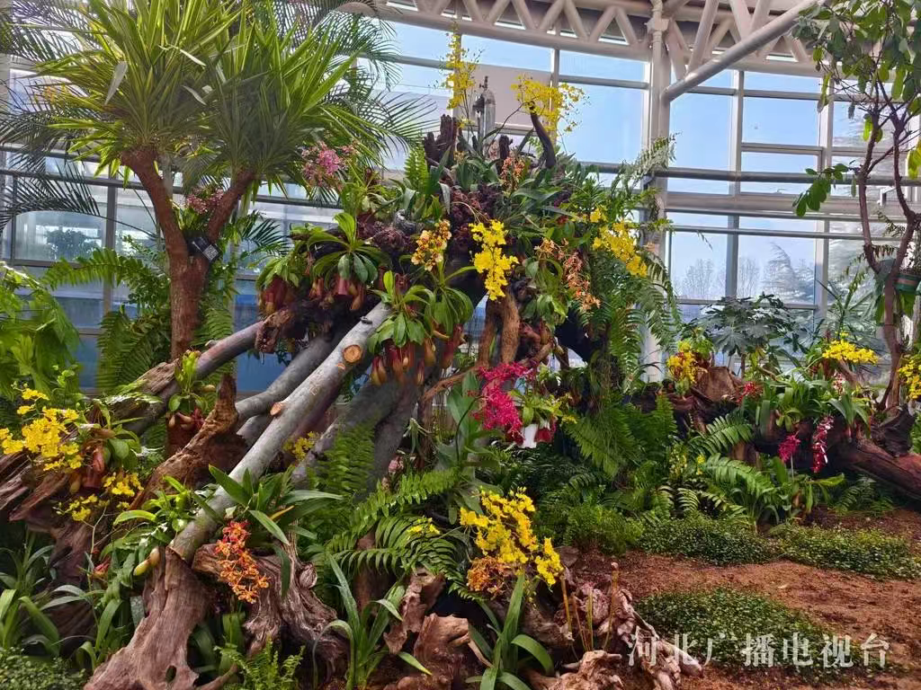 百花馆内,蝴蝶兰、兜兰、石斛、空气凤梨、积水凤梨、丝苇、槲蕨、鹿角蕨等植物附生在枯木与沉木之中,彼此相互映衬,展现着勃勃生机。场馆内的三角梅等花卉竞相绽放,屋顶的炮仗花、攀缘的灯笼花都为新春增添了喜庆的色彩。