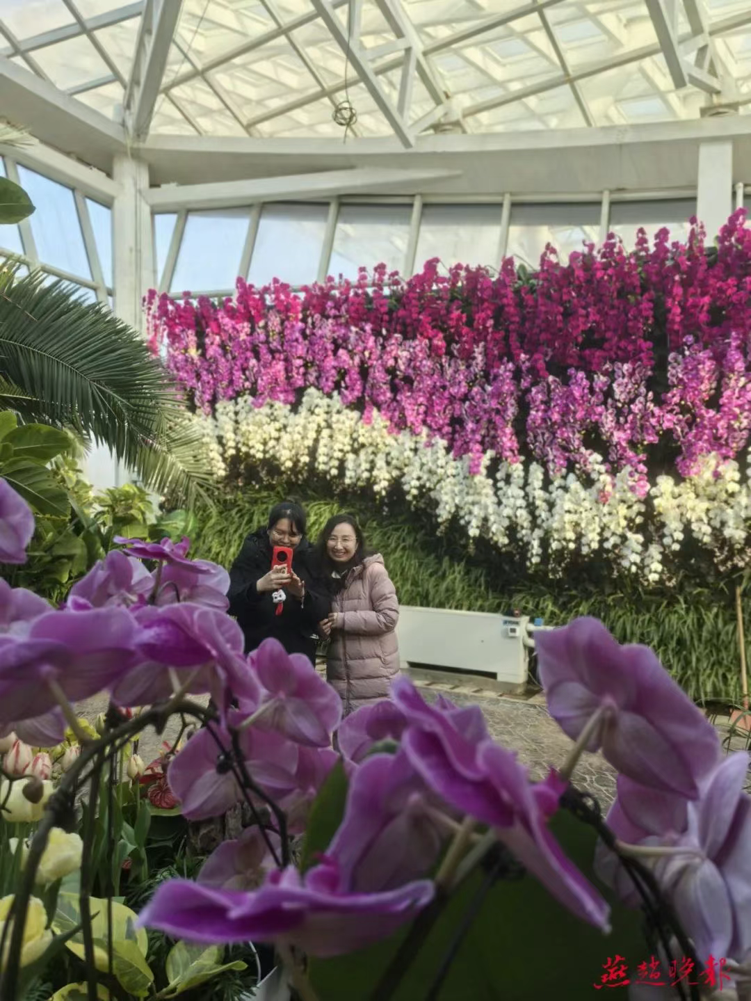 为了迎接新春佳节,园艺师还在花卉展馆和热带植物展馆内分别以“翩翩蝶舞”“缤纷乐章”“勃勃生机”为主题布置了三大植物景墙,共使用蝴蝶兰、杜鹃、红掌、矾根、秋海棠、鸟巢蕨等植物2万6千余株。三大景墙风格各异,吸引了不少游客拍照打卡。