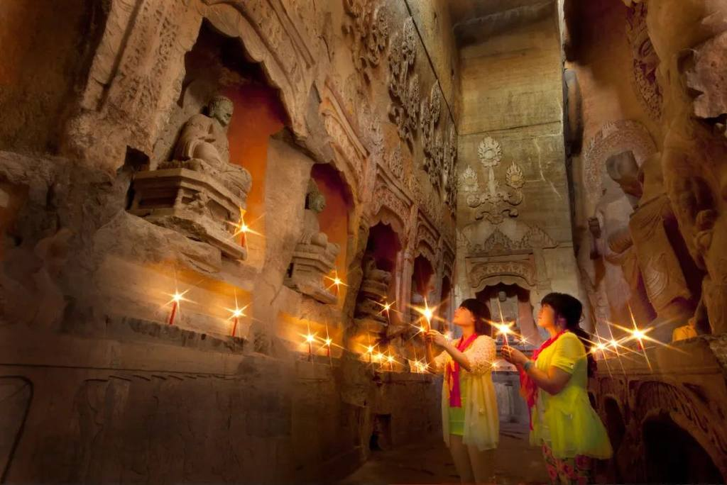 当夜幕降临,华灯初上,大家漫步于古寺、石窟之间,一边感受虔敬而庄重的氛围,一边参与当晚的重头戏——点灯祈福。