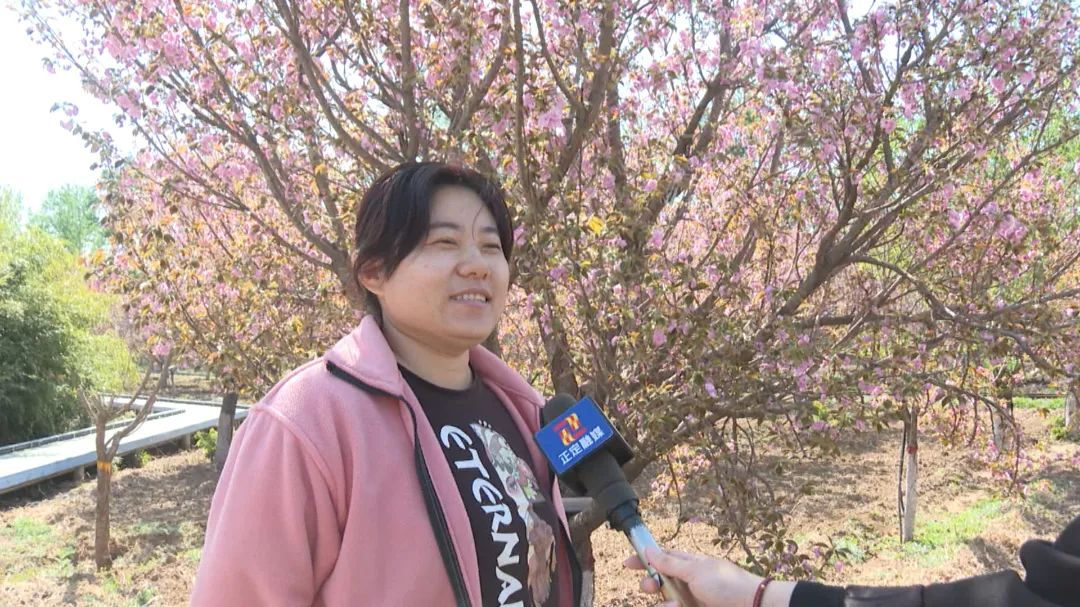 游客:这里的樱花开了,非常漂亮,我们穿着蓝色的旗袍来这里打卡留念,很出片。