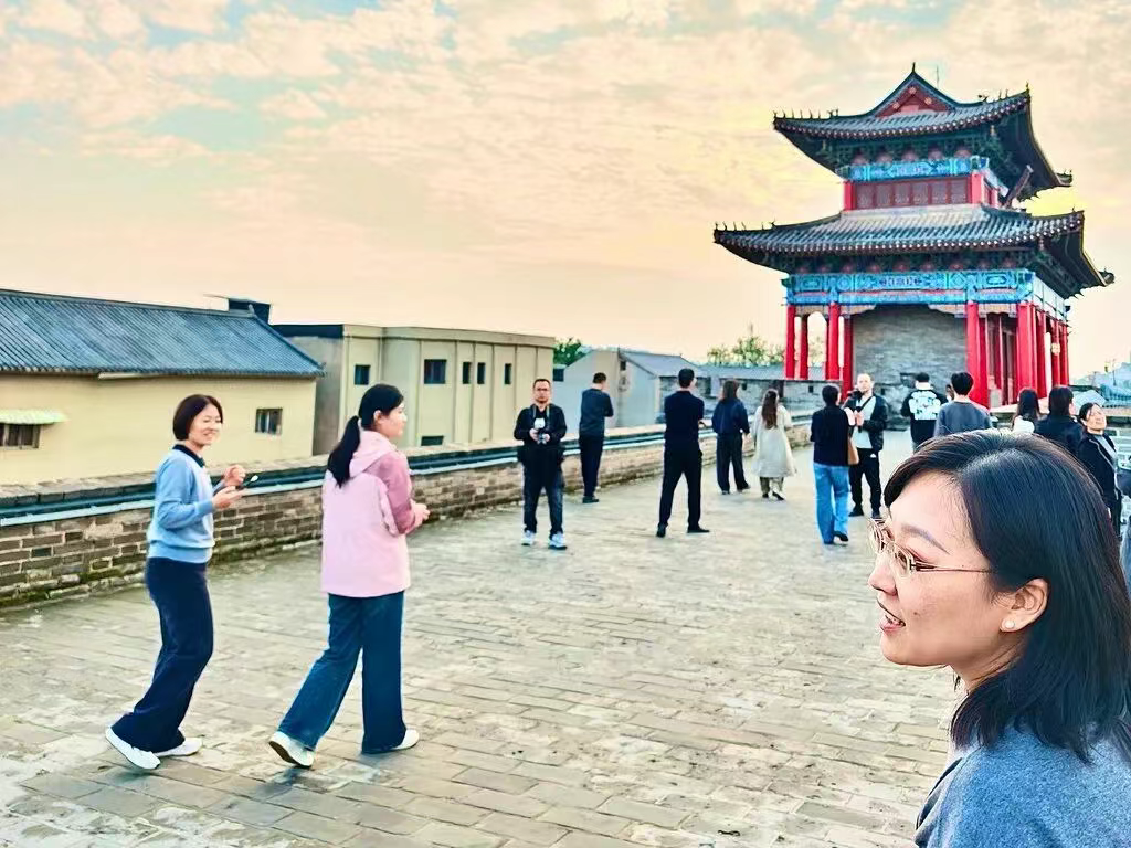 游客在城墙上漫步。刘萍摄黄昏时分是游览城墙的黄金时间