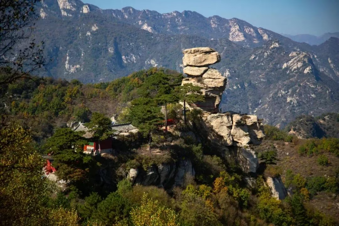 72拐盘山公路,曲折山道串联起太行深处的秋景,车窗边时而掠过彩林,时而遇见山泉,抵达山顶时,远眺群山如打翻的调色盘,震撼十足。莲花山的秋,藏着“自然奇景+传说故事”的浪漫,海拔1976米的黑崖如墨莲绽放,山顶的“补天石”旁,千年古松的枝叶间漏下秋阳,红的石、绿的松、黄的草叠在一起,恰如秋绘就的立体画卷,漫山红浪翻涌,连风都染上了秋的热烈。