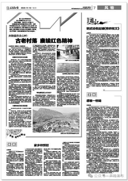 第六批中国传统村落、井陉县东尖山村,位于井陉东南部,地处太行山东麓,不仅保留着众多的明清时期的古民宅,还拥有丰厚的红色历史。抗战时期,东尖山村是129师385旅旅部驻地,井陉(路南)抗日县政府创建地、井陉(路南)正太游击大队创建地。刘伯承、邓小平等老一辈革命家曾在这里战斗生活过。