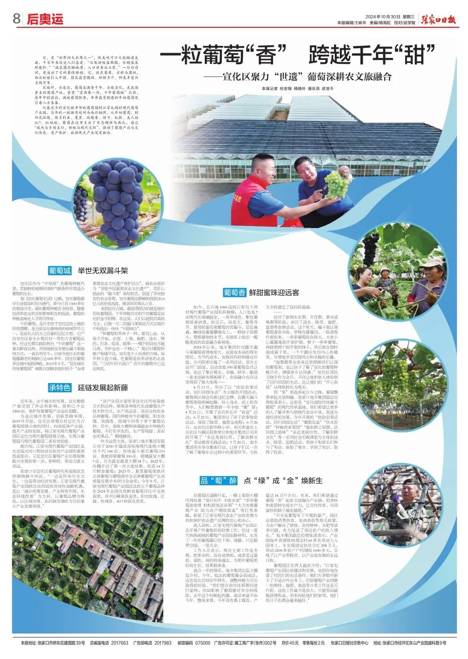 它,是“世界四大水果之一”,既美味可口又能酿造美酒,千百年来深受人们喜爱。“压架骈枝露颗圆,水精落落照晴轩。”“满筐圆实骊珠滑,入口甘香冰玉寒。”一句句诗词,更道出了它的柔情雅韵。它,就是葡萄,古称为蒲桃,西汉时被引入中国。因其晶莹圆润、甘甜多汁、种类丰富而名扬万里。 长城外,古道边,葡萄美酒香千年。古城宣化,是我国著名的葡萄产地,素有“京西第一府,千年葡萄城”之称。每年中秋前后,满城葡萄飘香,串串晶莹剔透的牛奶葡萄吸引着八方来客。 从春光乡的宣化城市传统葡萄园到江家屯镇的现代葡萄产业园,当年的一枝独秀延伸为南北相照,从牛奶葡萄,到阳光玫瑰、维多利亚、夏黑、玫瑰香、维可、红提、美人指A17、红地球,葡萄在这里生出了百态模样与面孔,通过“城内与乡间互补,传统与现代交织”,推动了葡萄产业与文化传承、遗产保护、旅游观光产业深度融合。 葡萄城 举世无双漏斗架 宣化区作为“中原派”的葡萄种植代表,其独特的地理环境和气候条件非常适合葡萄的生长。 据《宣化葡萄史话》记载,宣化葡萄最早引进栽培时间为唐代,距今已有1300多年的栽培历史。最初葡萄种植在寺院里,随着经济和农业的互相影响和互相促进,葡萄的种植逐渐走入寻常百姓家。 牛奶葡萄,是历史给予宣化这块土地的珍贵馈赠,是当前宣化最响亮的地域符号之一,是宣化人民为之自豪的记忆乡愁。它产自宣化区春光乡观后村一带的古老葡萄品种,经过长期实践培育出“牛奶葡萄”这一著名鲜食品种,并因地制宜发展出漏斗架栽培方式,一直沿用至今,目前当地生长的葡萄藤最老的树龄已达600多年。因宣化葡萄多在城中庭院种植,2013年5月,“宣化城市传统葡萄园”被联合国粮农组织授予“全球重要农业文化遗产保护试点”,被农业部评为“首批中国重要农业文化遗产”。其匠心独运的“漏斗架”栽培技艺,创造了举世独有的农业景观,宣化葡萄品牌被助推到20.6亿元的价值高度,傲居同类果品之首。 来到宣化古城,最值得探访的就是城市传统葡萄园,千年种植历史的牛奶葡萄是宣化的金字招牌。在这里,人们以庭院式栽培为主,以独一无二的漏斗架栽培方式在城市中构造出一块块“天圆地方”。 “种葡萄和养孩子一样,要花心血。从春天开始,出窖、上架、施肥、浇水、喷药、打条、掐须、疏果……哪个阶段也不能马虎,养护全在一个精心。”观后村葡萄种植户杨建平说,宣化是个小而美的古城,每年秋天逛古城、吃葡萄是很多游客的必选项,“刀切牛奶不流汁”的牛奶葡萄早已远近闻名。 承特色 延链发展起新藤 近年来,由于城市的发展,宣化葡萄产地受到了冲击和影响,面积已不足1500亩,保护发展葡萄产业迫在眉睫。 为适应城市发展,创新思路举措,2019年开始,宣化区将观后村定位为古葡萄园展示地的同时,向南延伸产业链,提升产业附加值,将江家屯现代葡萄产业园区定位为现代葡萄园展示地,实现古葡萄园与现代葡萄园二者有效衔接。 据介绍,江家屯现代葡萄产业园区是北京延庆对口帮扶宣化扶贫产业园的重要组成部分,又是宣化区葡萄产业实现规模振兴发展的第一步,影响性、带动力意义深远。 张家口市宣化区葡萄研究所高级农艺师梁晓静介绍说,“一边是传承历史文化,一边是带动经济发展,江家屯现代葡萄产业园抓住东西部扶贫协作战略机遇,是以‘城乡统筹发展、产业转型升级、生态环境改善’为方向,以葡萄品牌为特色,以区域发展、农民脱贫增收为目的重大产业发展举措。” “该产业园主要传承宣化区传统栽植方式和品种,展现各种现代先进葡萄生产技术和方式,生产高品质、高安全性的各品种葡萄。园内种植有牛奶葡萄、阳光玫瑰、玫瑰香、玫瑰牛奶等十多个葡萄品种,其中,连栋大棚和玻璃温室中种植的葡萄,不打化学农药,生产零残留、高安全的果品。”梁晓静说。 作为运营主体,张家口旭丰集团有限公司于2020年建成高标准现代连栋大棚15个约108亩、传统漏斗架式葡萄210亩、栽植排架葡萄100亩、玻璃温室大棚7亩、日光温室蔬菜大棚18个;2022年,冷棚开启了第一次大批结果,收获14万斤鲜食葡萄;2023年,夏黑葡萄荣获河北省葡萄与葡萄酒学会京津冀葡萄产业高质量发展学术研讨会金奖;今年9月,江家屯现代葡萄产业园送选的五个葡萄品种在2024年全国优质鲜食葡萄评比中全部获奖,其中巨峰荣获金奖,阳光玫瑰、红提、玫瑰香、A17斩获优质奖。 葡萄香 鲜甜蜜珠迎远客 如今,总占地1000亩的江家屯下湾村现代葡萄产业园初具规模:入口处是7亩现代化玻璃温室,一串串绿色、紫色葡萄低垂欲落,似宝石,似美玉,葡香芬芳。紧邻的莲花架葡萄仿若漏斗,层层叠叠,嫩绿色藤蔓攀缘而上,一群孩子仰着头,观察着细枝末节,在画纸上绘出一幅幅美丽的农旅融合新画卷。 2024年以来,旭丰集团针对露天漏斗架葡萄管理难度大,运营成本高的现实情况,为节约成本,发挥其科研和潜在价值,公司探索实施了一系列活动,首次主动开门迎客,启动首批100架葡萄会员认领,走出了集合观光、采摘、研学、酿造一条龙创新发展新路子,农旅融合也在这里得到了极大体现—— 4月13日,举办了以“体验农事活动,回归田园生活”为主题的开园活动,葡萄架认领会员接过纪念牌,在露天漏斗葡萄架前挥锹起藤、培土浇水。泥土的芬芳中,人们畅想着新一年丰收“葡