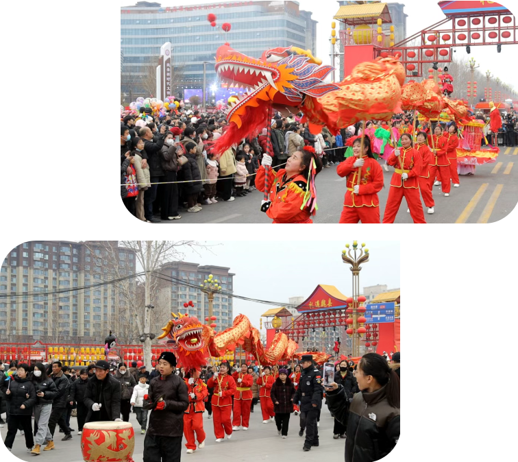 人们正出神的看着表演的时候,一阵鼓声响起,舞龙表演者迈着轻快的步伐也隆重登场了。随着激昂的鼓点响起,舞龙队伍瞬间动了起来,舞龙者们配合默契,他们身着鲜艳的服装,与巨龙的颜色相互映衬,每个人都全情投入,脚步灵活多变,时而快步奔跑,时而原地旋转,他们手中的木杆稳稳地掌控着巨龙的行动,让巨龙仿佛拥有了生命一般。