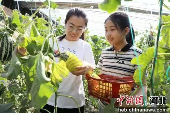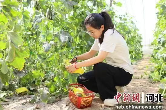 近日,正是果蔬成熟的季节,在河北省南宫市段芦头镇南张庄村果蔬种植基地的温室大棚里,大棚甜瓜、香瓜、西瓜等果蔬进入采摘期,游客们手拿小篮穿梭其中,一边采摘果蔬,一边享受惬意的美好时光。图为在南宫市段芦头镇南张庄村果蔬种植基地的温室大棚里游客正在采摘游玩。 王林 摄