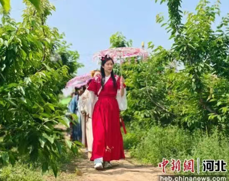此次活动由中共望都县委、望都县人民政府主办,旨在依托樱桃、辣椒、草莓、葡萄及其他农特产品种植优势,通过文旅搭台、经济唱戏,进一步提高该县知名度和美誉度,并开展消费品“以旧换新”活动,促进农文旅商等领域消费持续提升。 游客身着汉服在樱桃园游玩。 栗志安 摄