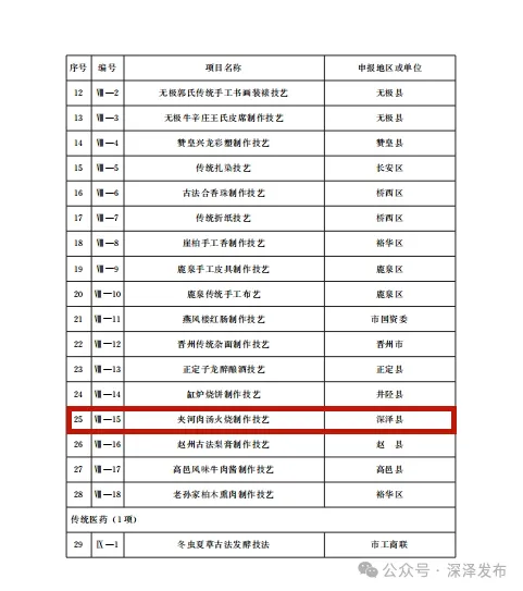 5月26日,石家庄市公布第十批市级非物质文化遗产代表性项目名录,我县夹河肉汤火烧制作技艺入选。