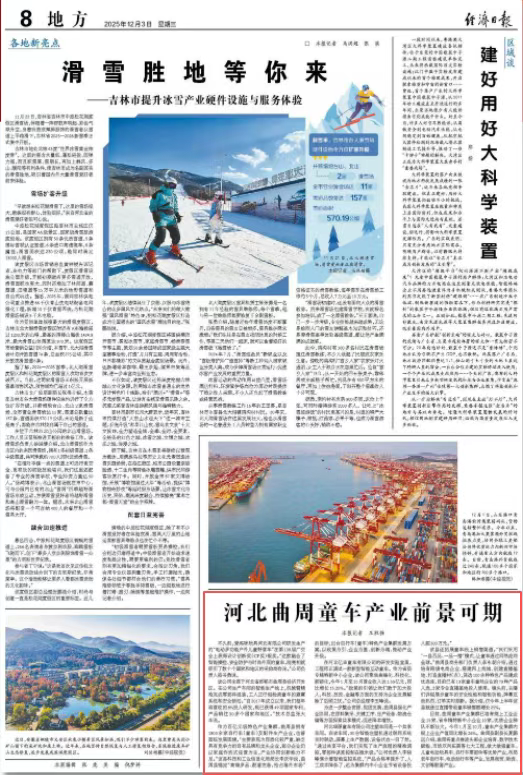 在河北亿丰童车有限公司的研发实验室里,工程师正调试一款新型智能互动童车。作为省级专精特新中小企业,该公司聚焦高端化、科技化、新颖化,今年1月至10月营业收入达1.53亿元,同比增长15.20%。“政策的引领让我们敢于加大投入,科技、技改、金融等方面的支持为企业发展解除了后顾之忧。”公司总经理李玉峰说。