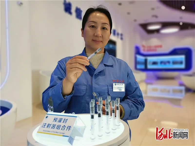 在沧州四星联合医药包装有限公司展厅,工作人员在展示预灌封注射器。 图片来源:河北新闻网