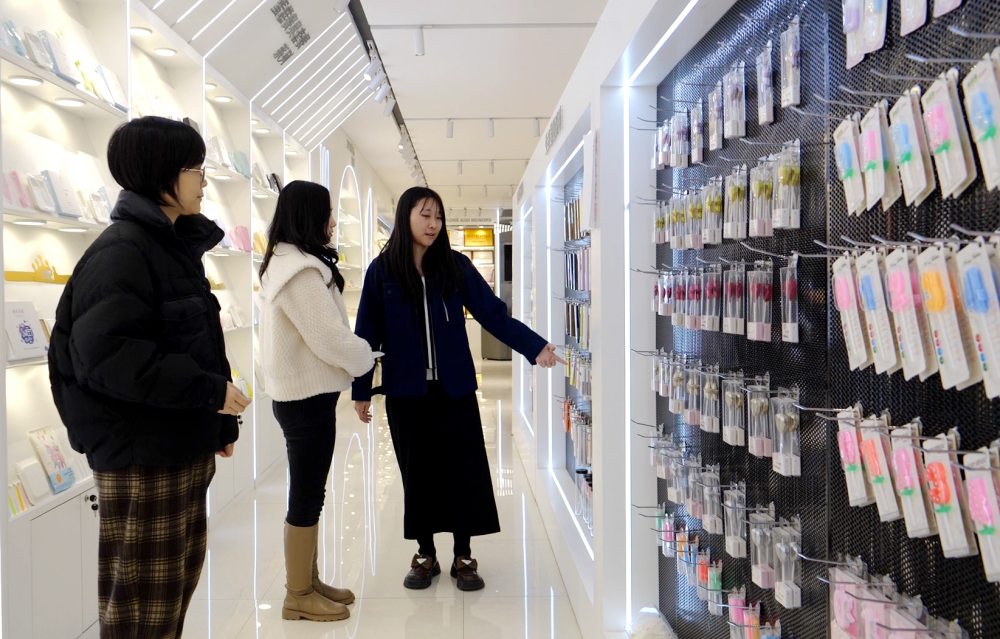 在东汪镇蜡烛企业展厅内,工作人员向顾客介绍蜡烛产品。新华社记者王晓摄